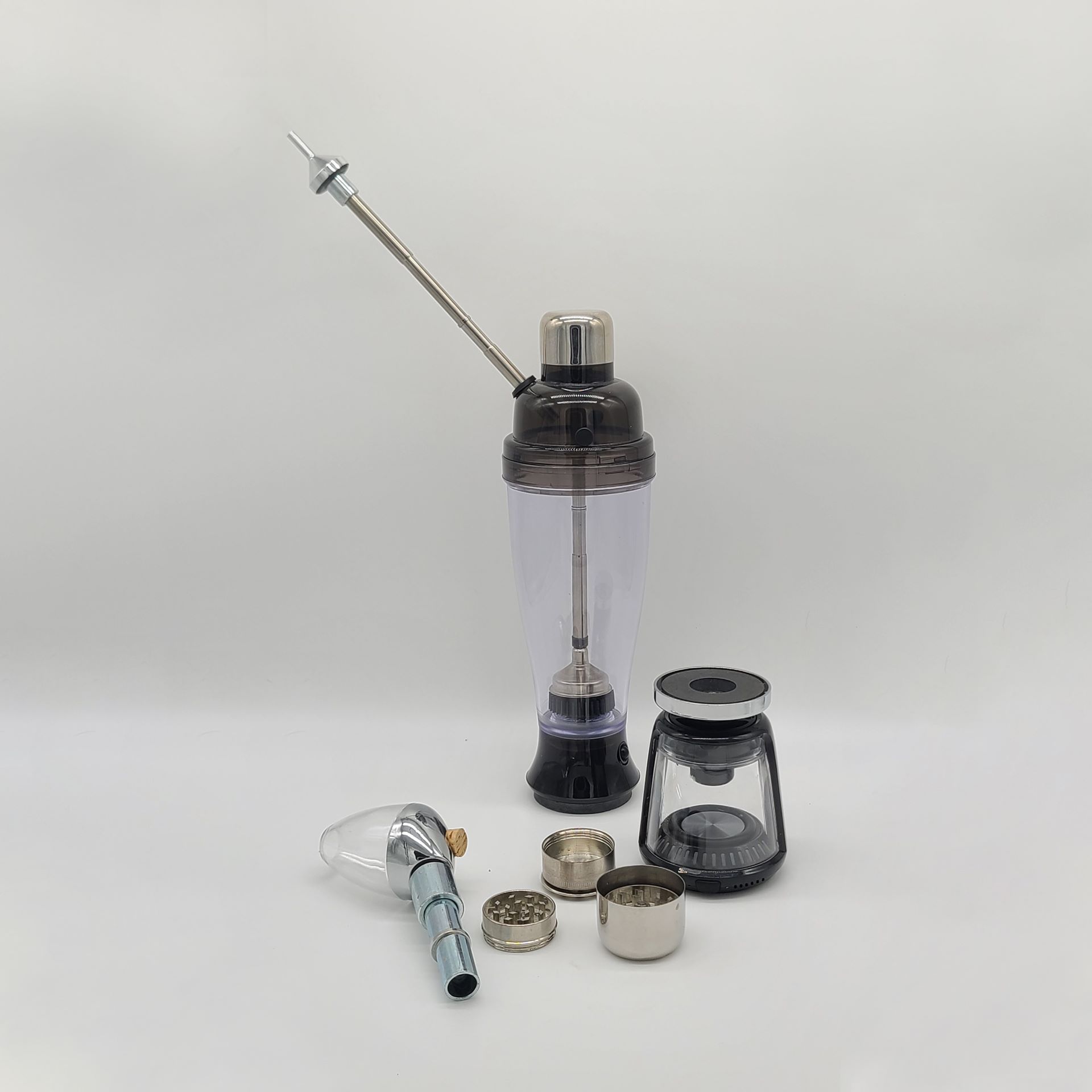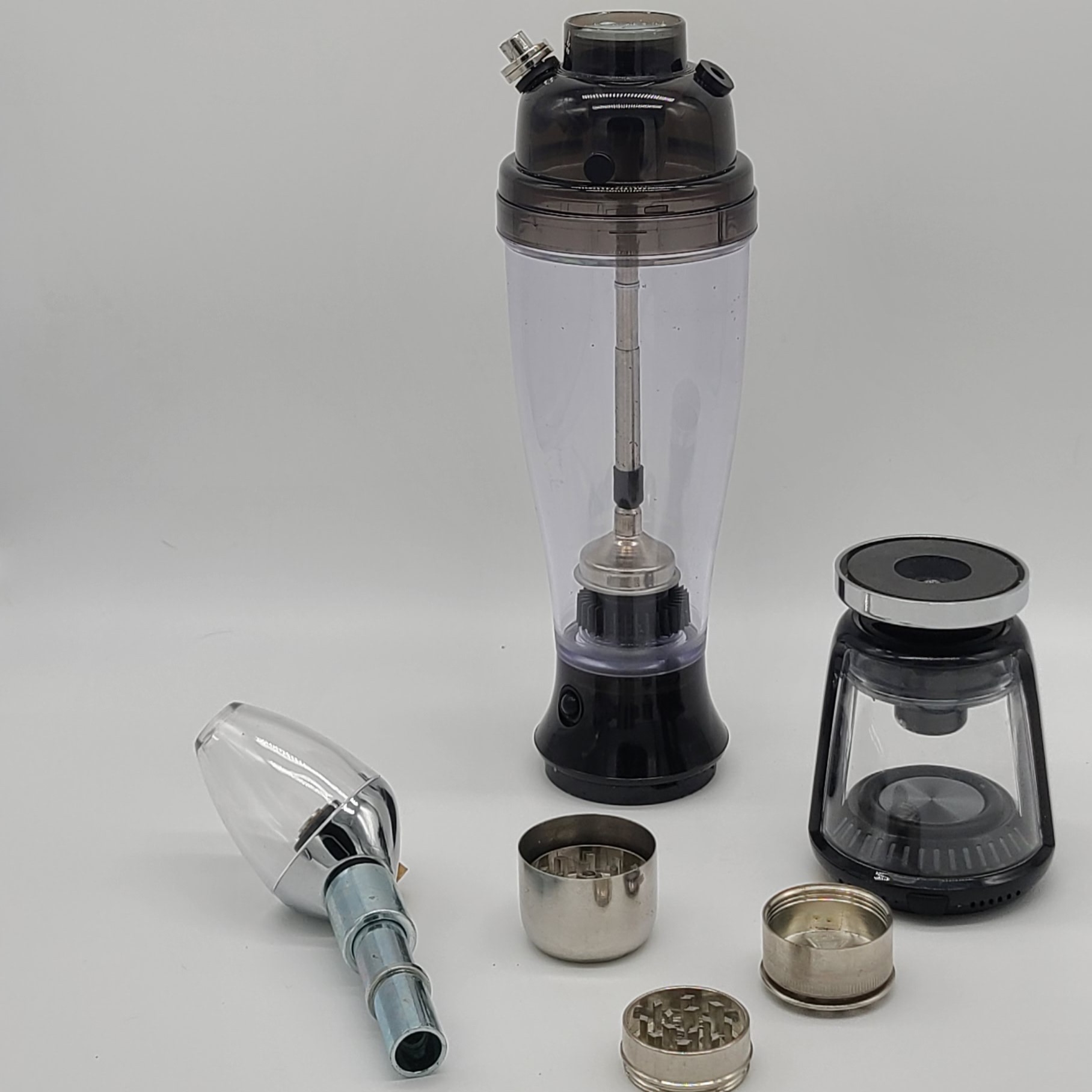 3 stage magnetic grinder Qloudpipe cyclonic filteration system Telescopic reducer mouthpiece 5watt magnetic bluetooth speaker w/super bass 4ct hiquick rechargeble AAA batteries Thundebolt AAA batterie charger Aluminum carry case 50 pack of screens